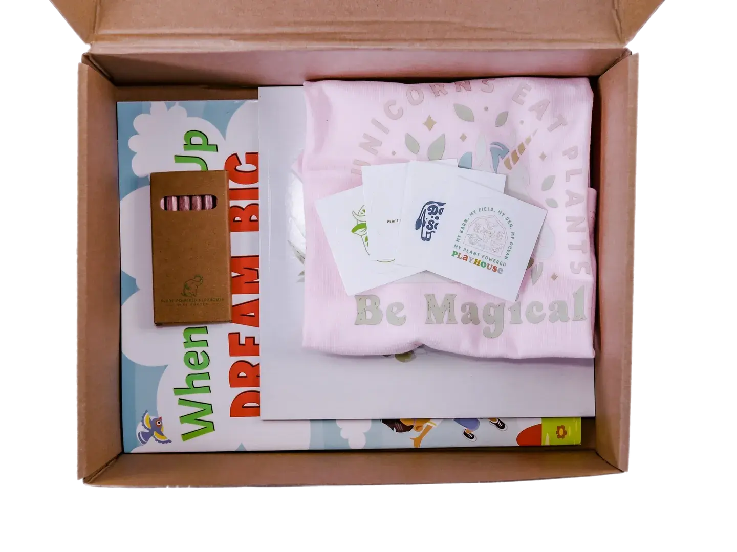 The unicorn is a symbol of magic and mystery. Take your child on a journey to discover their own magical powers with our Be Magical & Dream Big gift box. This box contains everything you need to fuel your child’s imagination, including a Real Unicorns Eat Plants short-sleeve tee, “When I Grow Up” Dream Big reading & coloring books exploring professions that conserve, preserve & protect animals & the environment. Galvanize their curious mind with our Dream Big reading & coloring books, exploring professions that conserve, preserve & protect animals & planet. Also included is our Plant Powered Kid notebook, coloring pencils & 4 sticker pack! Your child will love these captivating accessories that are sure to spark their imagination!